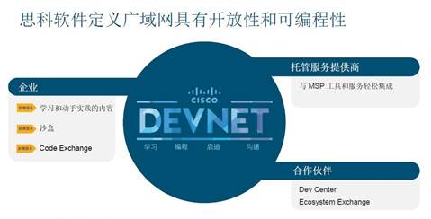 除了提供卓越的安全和應用體驗外,思科SD-WAN還具備開放性與可編程性。曹圖強表示,“首先,思科將通過 DevNet 開發(fā)平臺向所有用戶開放API,為開發(fā)人員提供更大價值;其次,對合作伙伴而言,思科希望提供一個可交互的平臺幫助用戶進行分享。任何用戶有特殊的需求,可以在DevNet 與大家分享。具體來說,在整個安全的廣域網(wǎng)部署中, IT人員可以通過開放的平臺,根據(jù)不同的環(huán)境和需求進行二次開發(fā)!